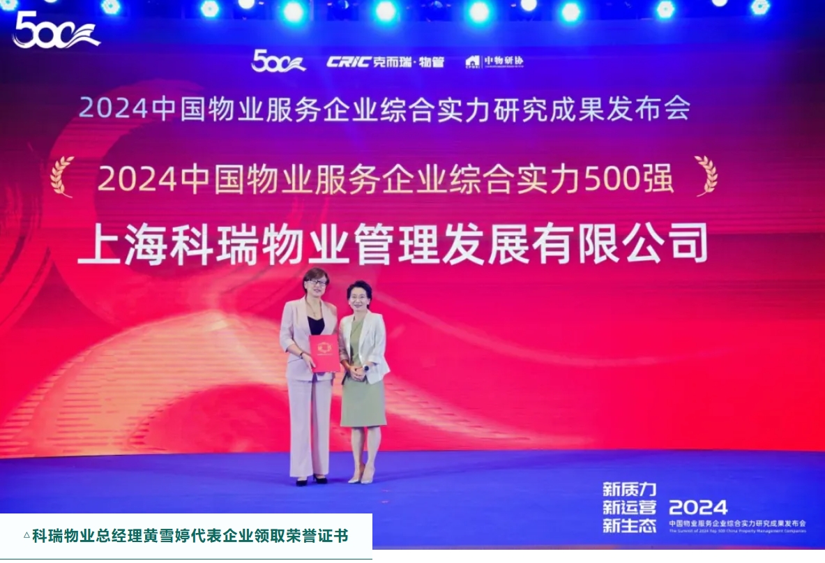 8月22日,2024中國(guó)物業(yè)服務(wù)企業(yè)綜合實(shí)力研究成果發(fā)布會(huì)在上海舉辦。來自全國(guó)各地的30余家省市級(jí)物業(yè)協(xié)會(huì)會(huì)長(zhǎng)、秘書長(zhǎng),50余位大咖嘉賓,近600位物業(yè)上下游產(chǎn)業(yè)鏈的行業(yè)同仁齊聚。會(huì)議發(fā)布了“2024中國(guó)物業(yè)服務(wù)企業(yè)綜合實(shí)力500強(qiáng)”“2024中國(guó)物業(yè)服務(wù)企業(yè)綜合實(shí)力細(xì)分領(lǐng)域”“2024中國(guó)物業(yè)管理卓越標(biāo)桿項(xiàng)目”等一系列研究成果,以物業(yè)綜合實(shí)力領(lǐng)域權(quán)威成果為行業(yè)樹立了年度風(fēng)向標(biāo)。 在「2024中國(guó)物業(yè)服務(wù)企業(yè)綜合實(shí)力研究成果」中,科瑞物業(yè)憑借穩(wěn)健的財(cái)務(wù)表現(xiàn)、卓越的運(yùn)營(yíng)能力和良好的服務(wù)口碑,榮獲“2024中國(guó)物業(yè)服務(wù)企業(yè)綜合實(shí)力50強(qiáng)第42名”,較去年提升4位。 榮獲“2024中國(guó)產(chǎn)業(yè)園區(qū)物業(yè)服務(wù)領(lǐng)先企業(yè)”“2024中國(guó)行政辦公物業(yè)服務(wù)領(lǐng)先企業(yè)”以及“2024中國(guó)紅色物業(yè)服務(wù)領(lǐng)先企業(yè)”。 榮獲“2024中國(guó)物業(yè)管理卓越標(biāo)桿項(xiàng)目——上海市五愛高級(jí)中學(xué)(學(xué)校)”“2024中國(guó)物業(yè)管理卓越標(biāo)桿項(xiàng)目——上海綠地中環(huán)廣場(chǎng)(產(chǎn)業(yè)園區(qū))”共計(jì)六項(xiàng)榮譽(yù)。