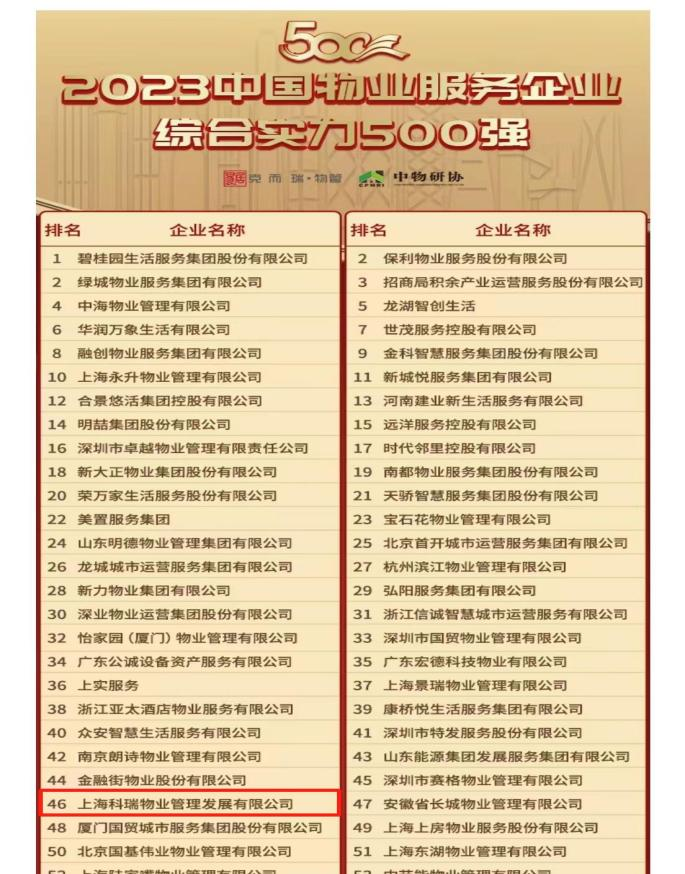 6月28日,克而瑞物管和中物研協隆重發(fā)布2023中國物業(yè)服務企業(yè)研究成果,同期揭曉2023中國物業(yè)服務企業(yè)綜合實力500強企業(yè),科瑞物業(yè)憑借強大的綜合實力,榮膺“2023年中國交通樞紐物業(yè)服務領先企業(yè)”、“2023中國物業(yè)服務企業(yè)綜合實力500強” 第46位,排名較上年再提升2位。